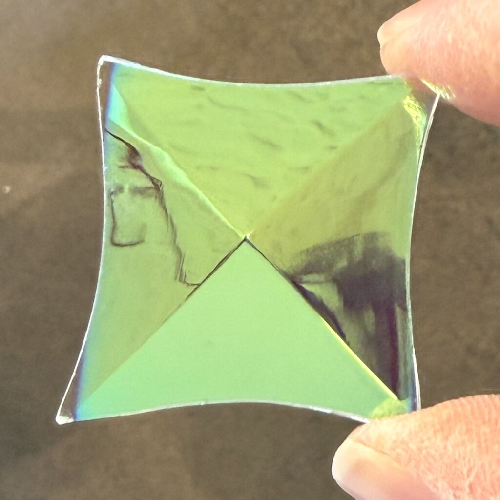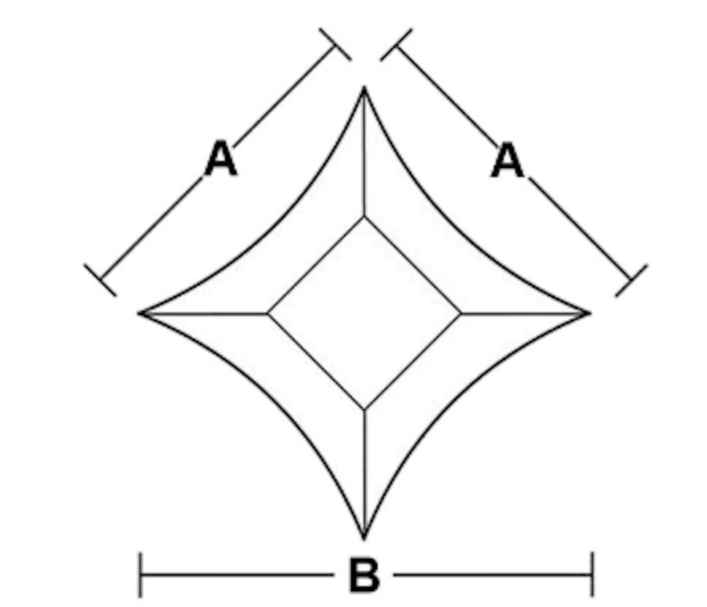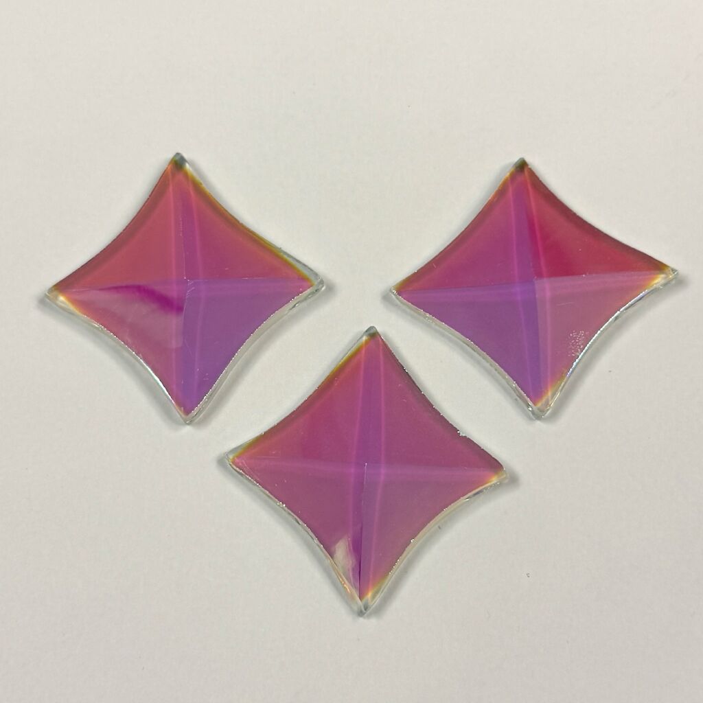 Stunning Dichroic Concave Square Beveled Glass measures approximately 1 1/2″ from point to point. Color goes magenta to green/yellow at different angles of light and may have slight imperfections in the coating. Like any Dichroic coating, it may be sensitive to chemicals. Limited stock. A = 1 1/8″ B = 1 1/2″ approximately