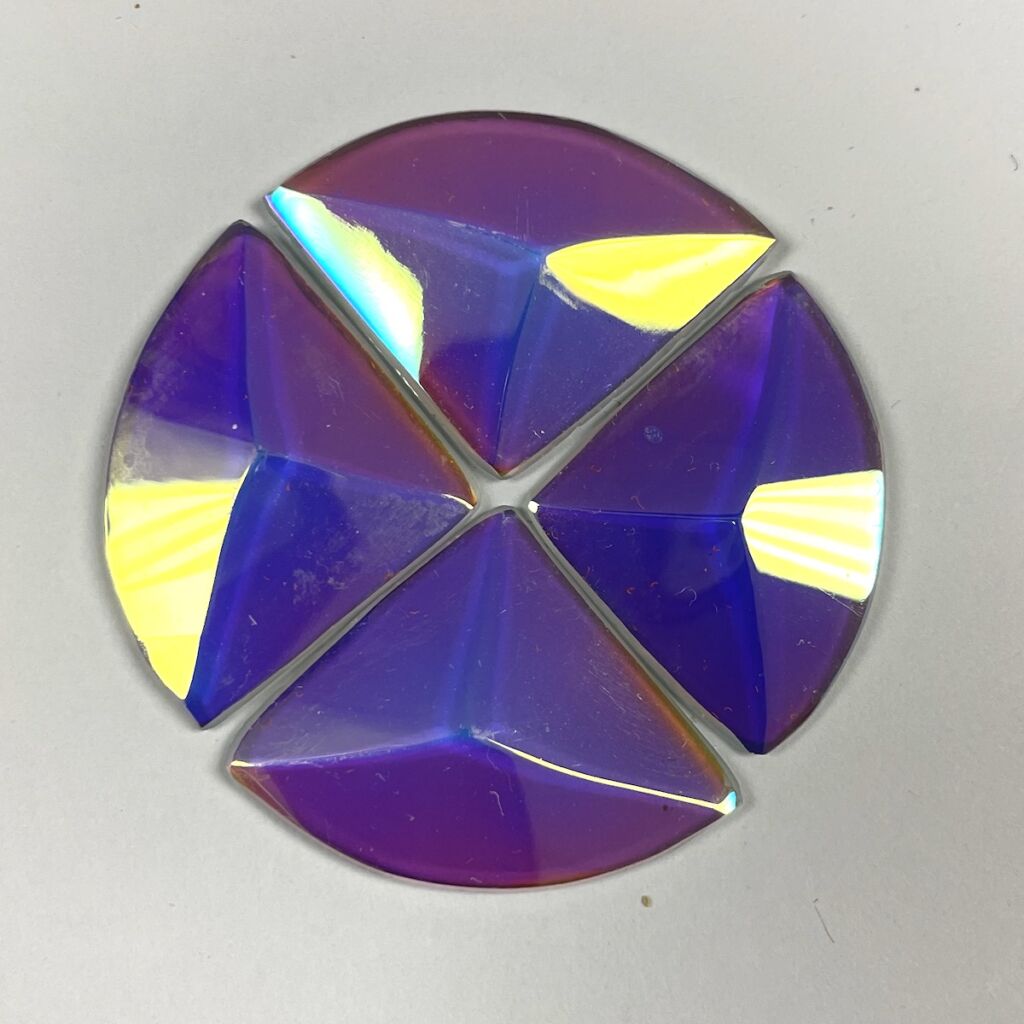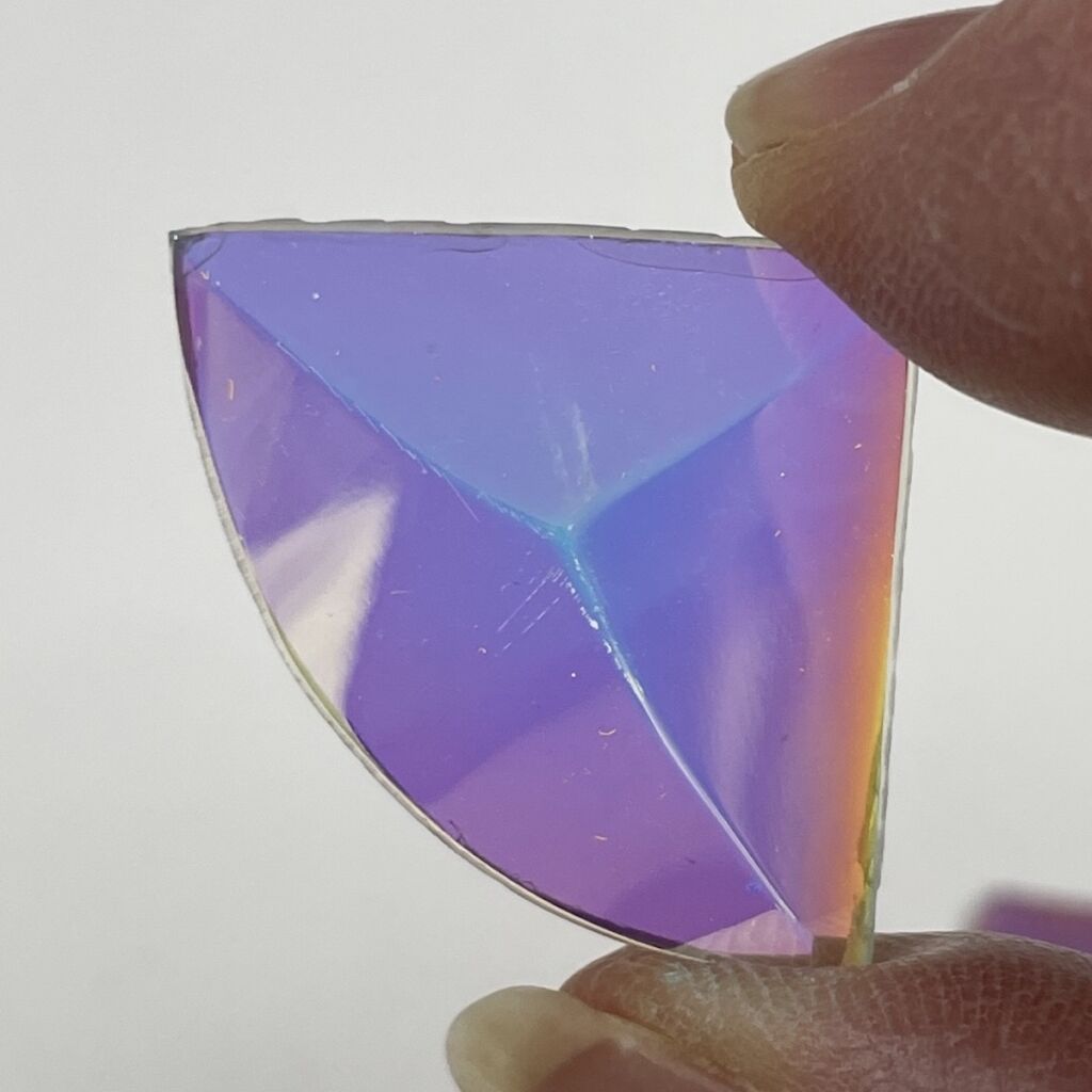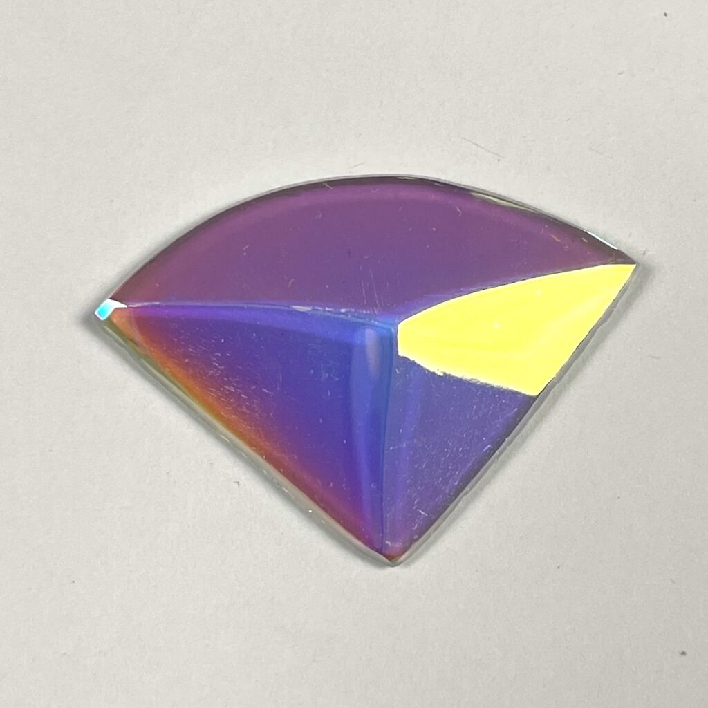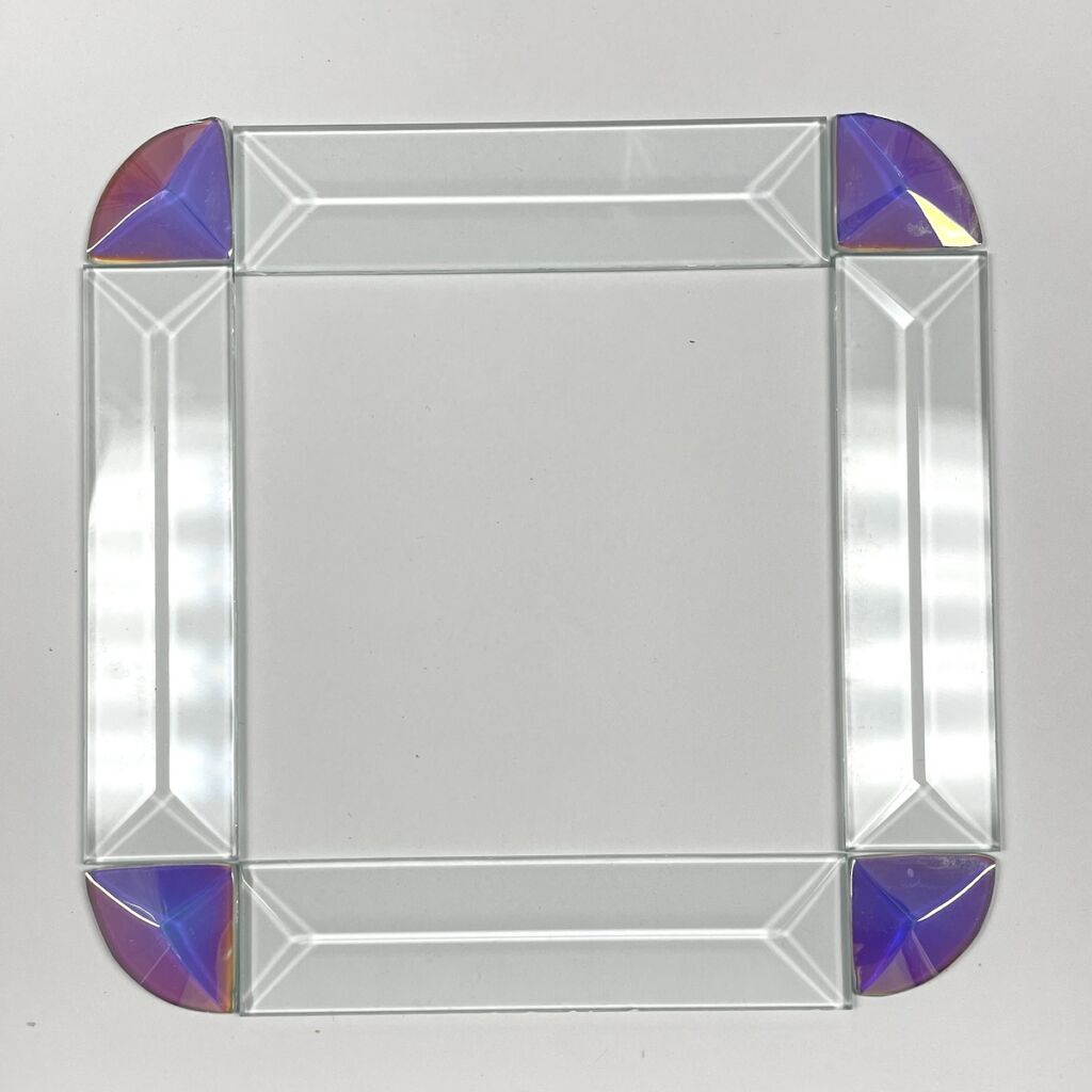 Really Cute Dichroic Quarter Round Beveled Glass measures 1″ x 1″. The bevel has dichroic coating and matches up to 1″ bevel border. Put 4 together for a 2″ circle. Color varies and may have slight imperfections in the coating. Like any Dichroic coating, it may be sensitive to chemicals. Limited stock, clear straight line bevels not included. Dichroic color may vary.