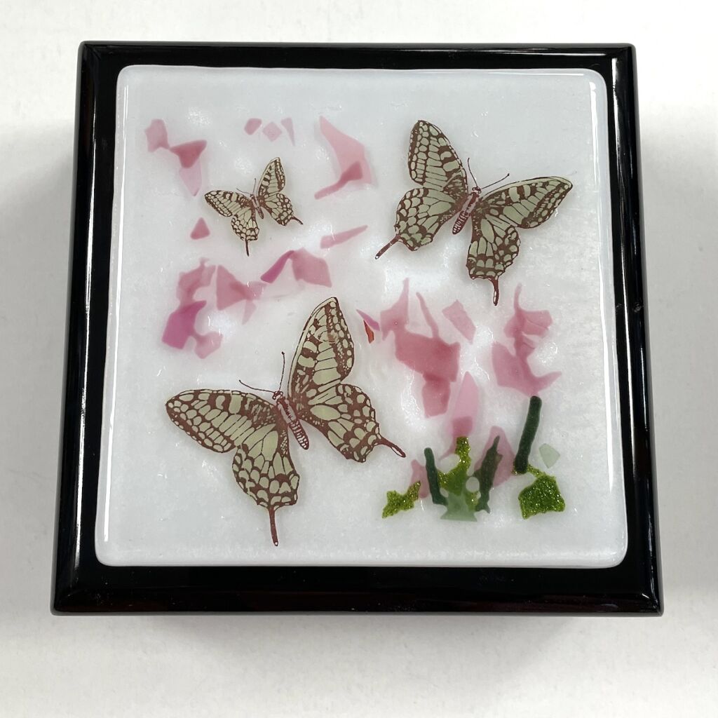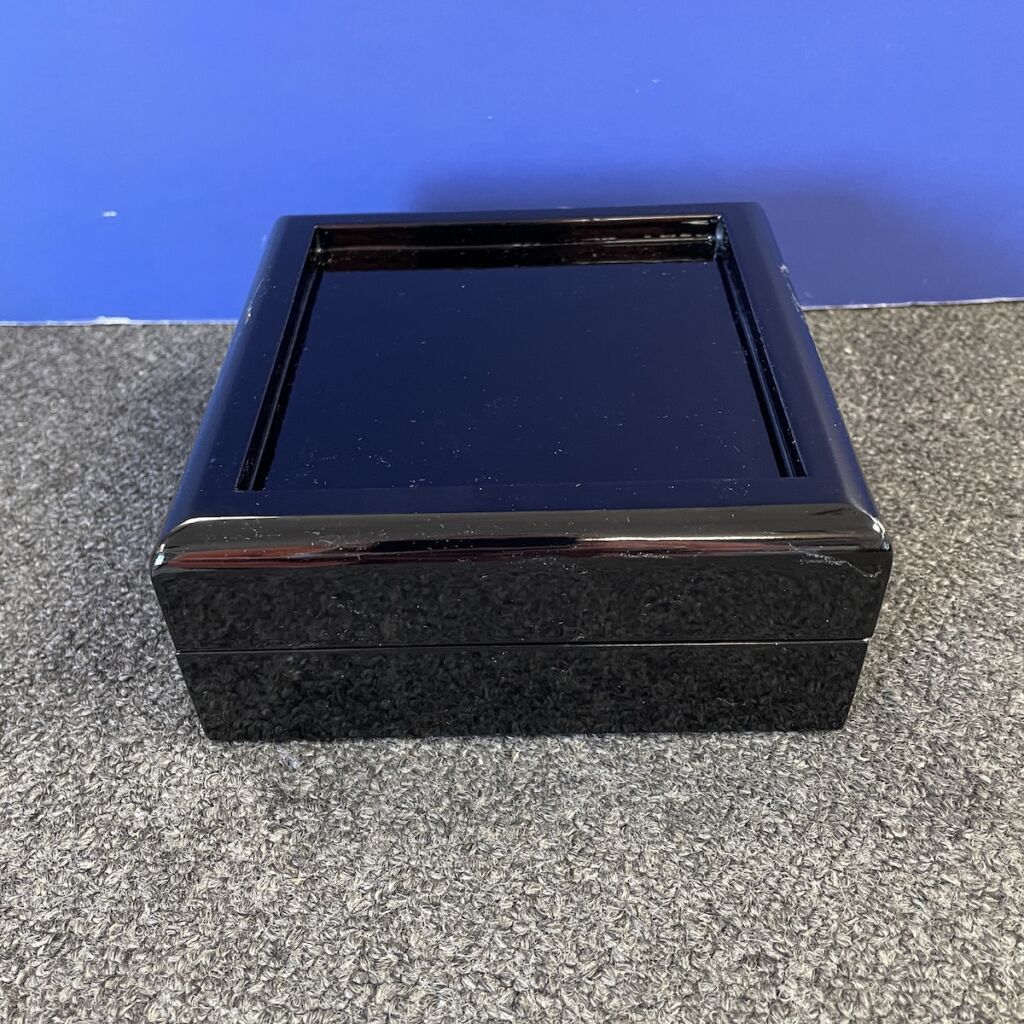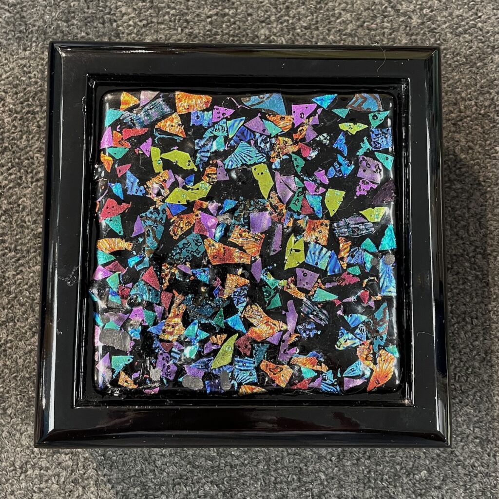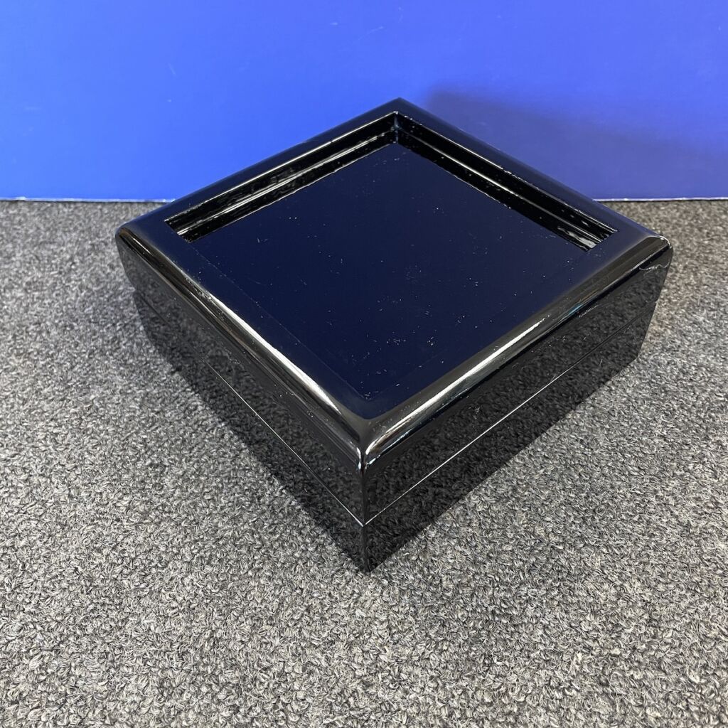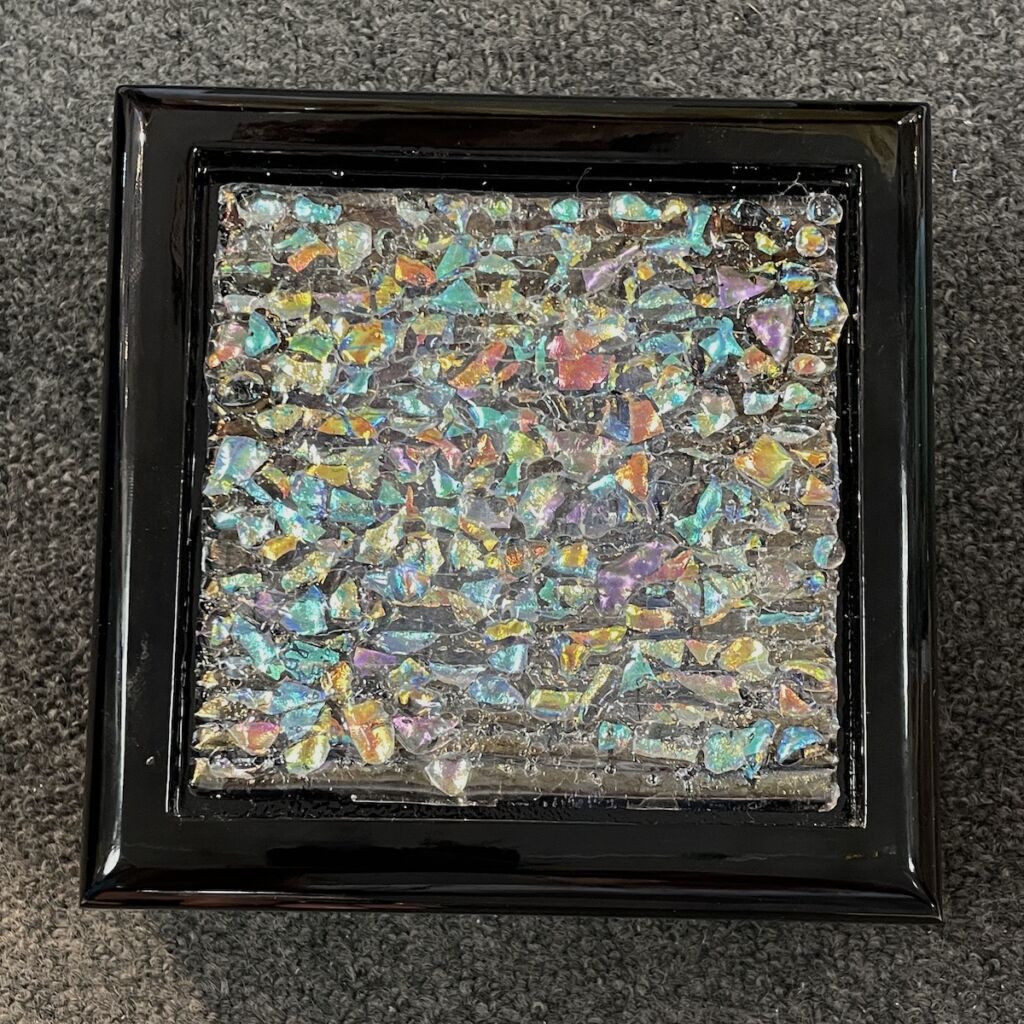 Black Lacquer Tile Box (4.25″ tile) is perfect for displaying your Fused tile artwork or fused glass elegantly and inexpensively. The design of this box is simple and it will not distract from your artwork. It has a lovely black finish with a velvet liner that will highlight your artwork. This box comes in a nice gift box. Dimensions: Color: Black Lacquer – Outside Dimensions: Approx. 2 1/4″ Height, 5 1/2″ sq. Inside Tile Dimensions: 4 1/4″, 1/4″ Lip Depth: Tile not included!