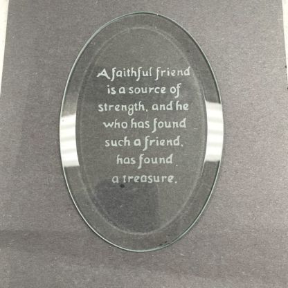 Wheel engraved 4″ x 6″ oval bevel with the saying “A faithful friend is a source of strength, and he who has found such a friend has found a treasure”