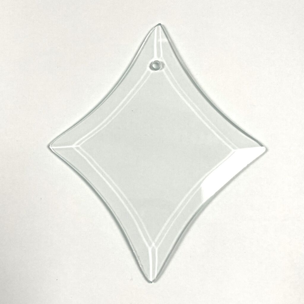 Clear Diamond Shape Bevel with hole in the top. Great for etching! Measures approx. 3 1/4″ x 4″. Limited Stock