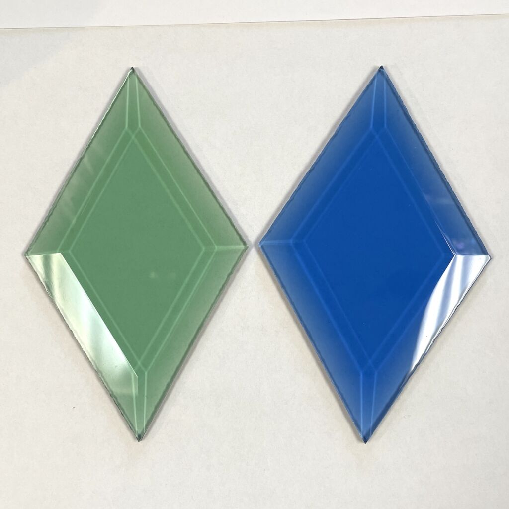 Diamond Beveled Colored Glass measures 3″ x 5″, top quality. Limited stock.