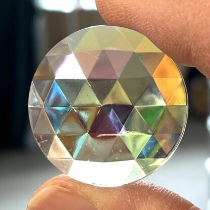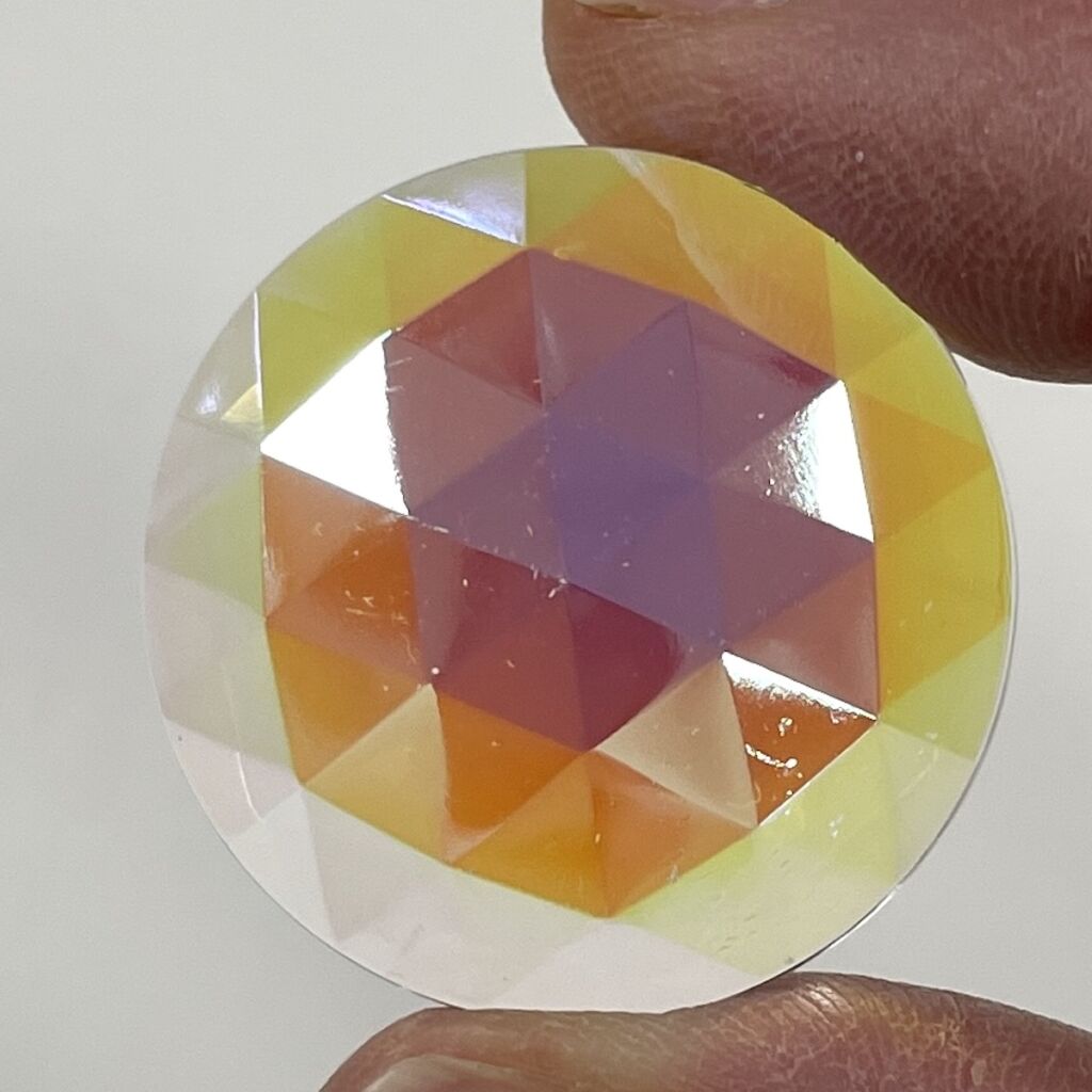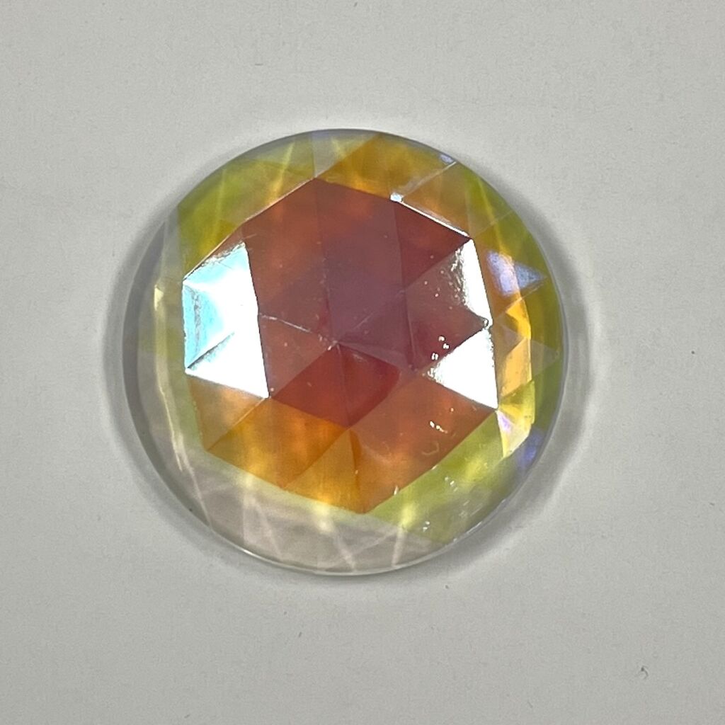 These are real Dichroic Coated glass jewels with the front face itself coated, not a thin piece of dichroic laminated to the back side. These real Dichroic coated treasures will catch the light differently with each facet or textured detail of the jewel. It is hard to describe the stunning effect. Each jewel will have variations of color which gives them a dynamic look, changing with light angles. The edge thickness can also vary slightly, the small ones at times slightly less than 1/8″ and the larger jumbo jewels running a little thicker at times.
