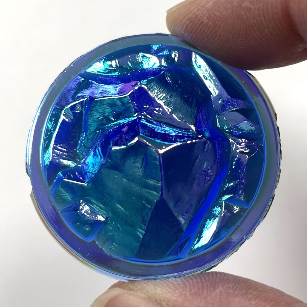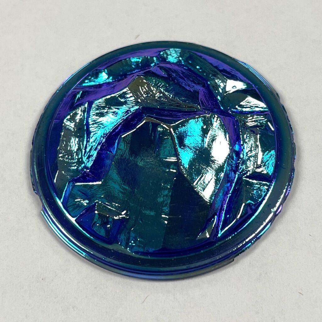 This 38mm (1 9/16″) Round Lava Jewel has a blue base and is very eye-catching with it’s dichroic coating.