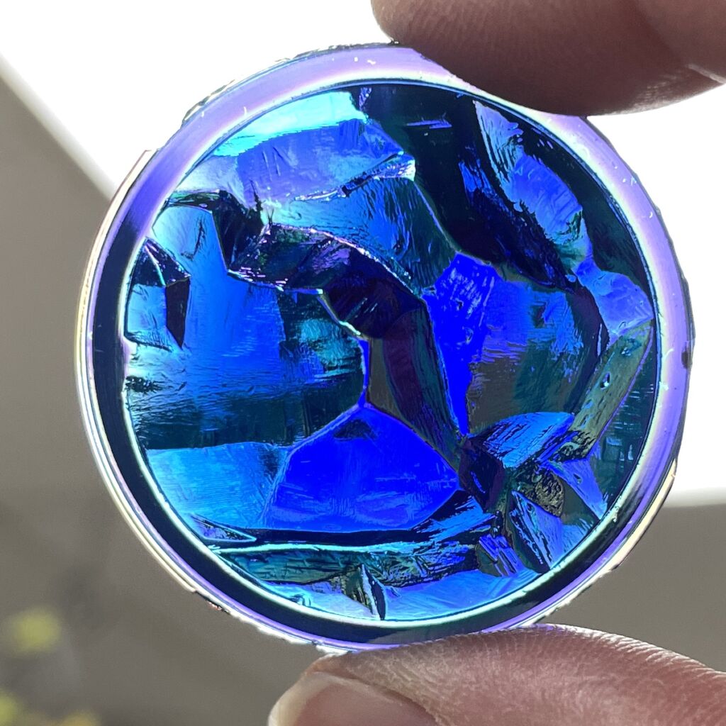 These are real Dichroic Coated glass jewels with the front face itself coated, not a thin piece of dichroic laminated to the back side. These real Dichroic coated treasures will catch the light differently with each facet or textured detail of the jewel. It is hard to describe the stunning effect. Each jewel will have variations of color which gives them a dynamic look, changing with light angles. The edge thickness can also vary slightly, the small ones at times slightly less than 1/8″ and the larger jumbo jewels running a little thicker at times.