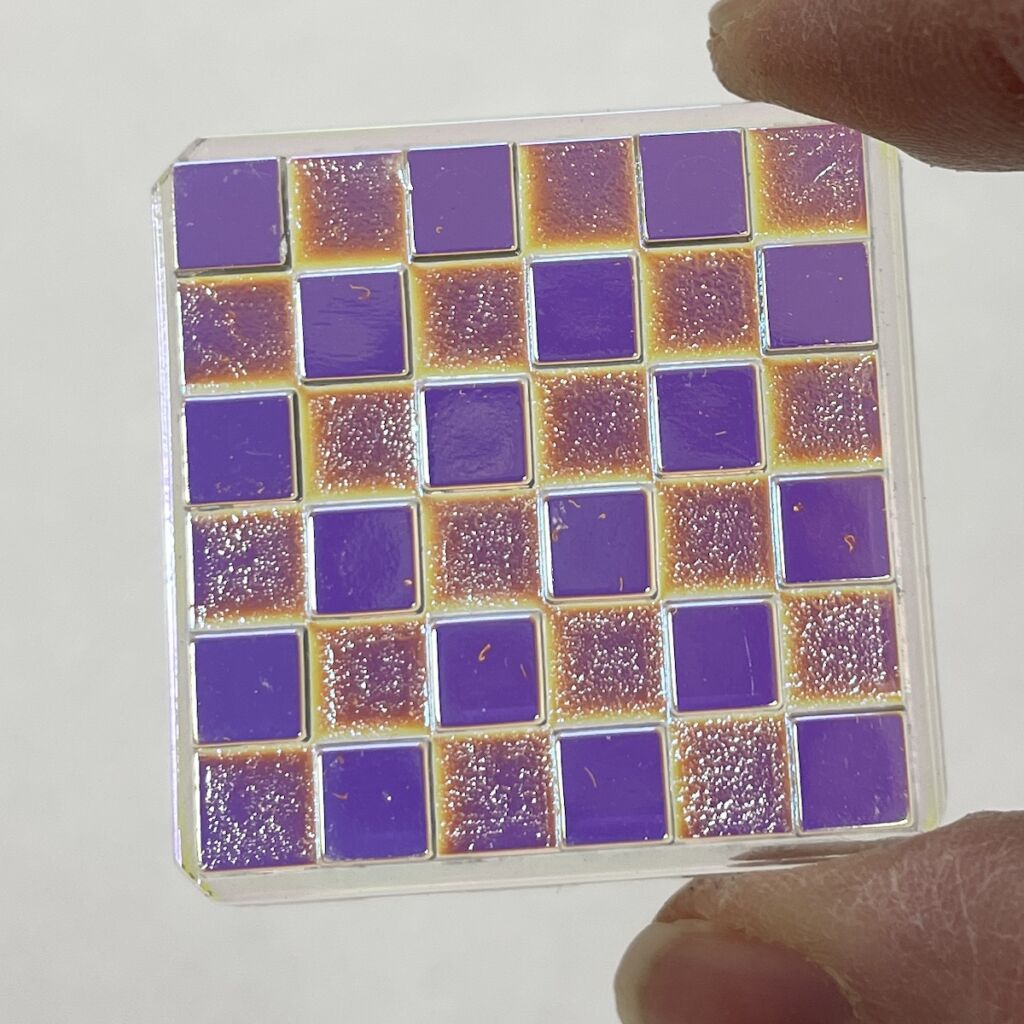 These are real Dichroic Coated glass jewels with the front face itself coated, not a thin piece of dichroic laminated to the back side. These real Dichroic coated treasures will catch the light differently with each facet or textured detail of the jewel. It is hard to describe the stunning effect. Each jewel will have variations of color which gives them a dynamic look, changing with light angles. The edge thickness can also vary slightly, the small ones at times slightly less than 1/8″ and the larger jumbo jewels running a little thicker at times.