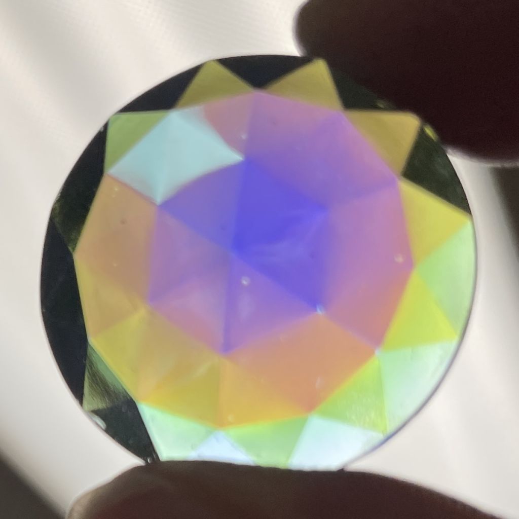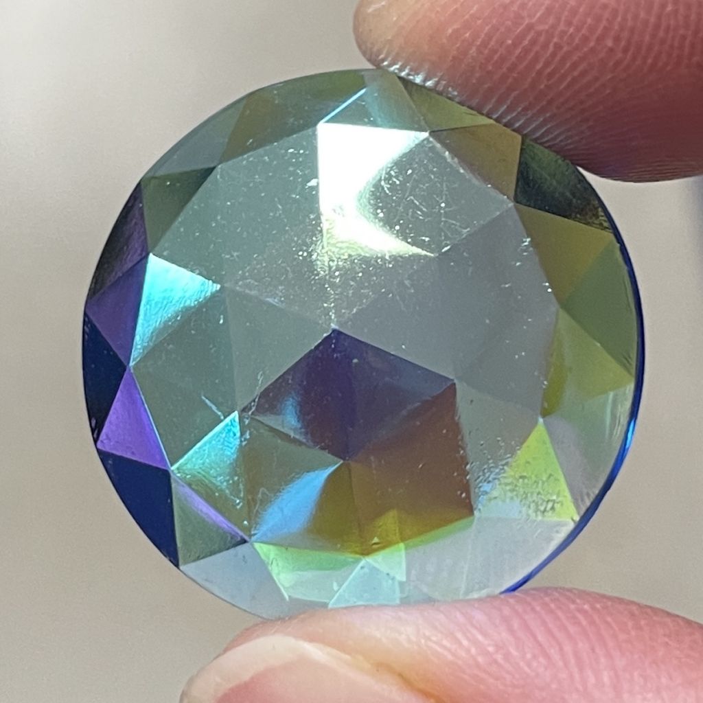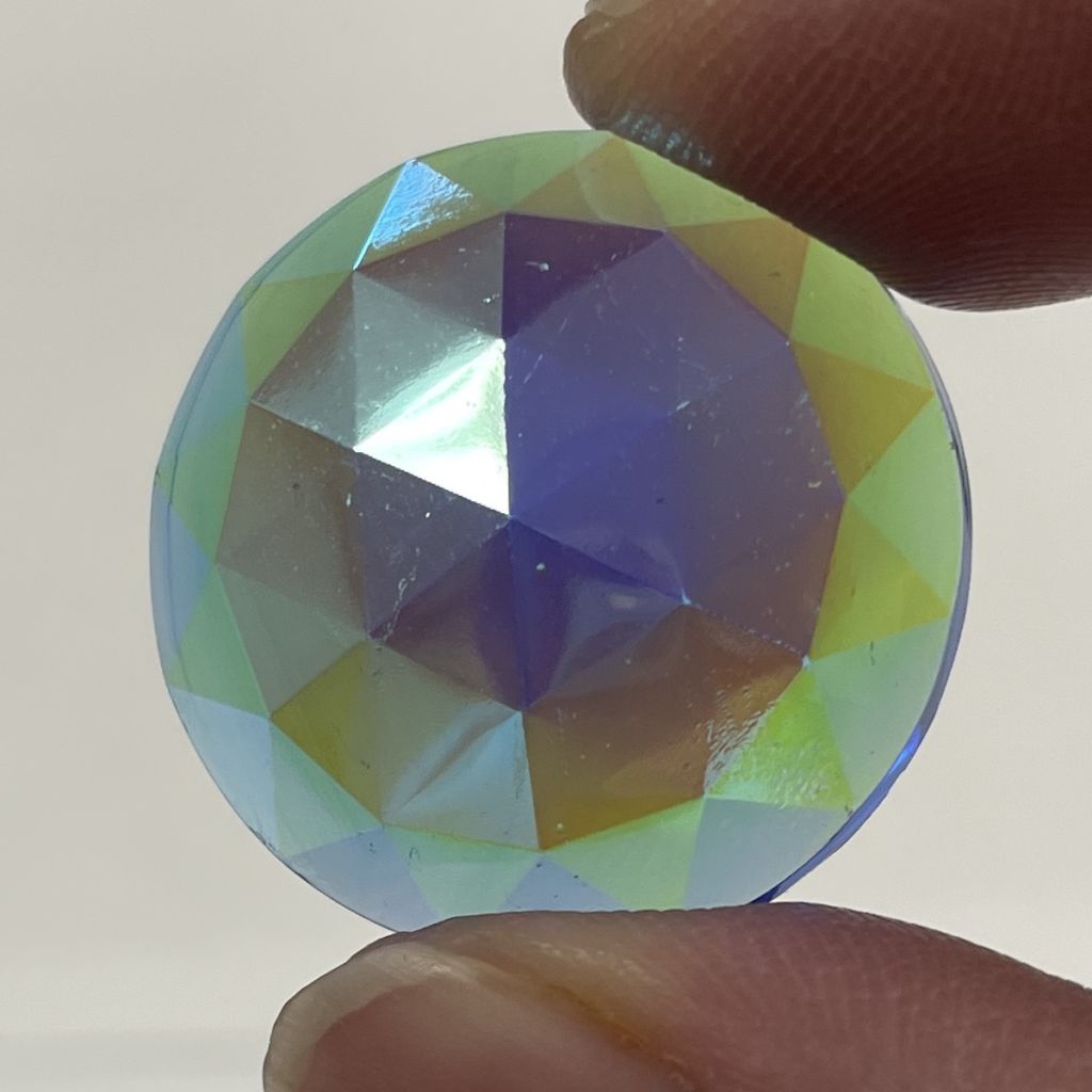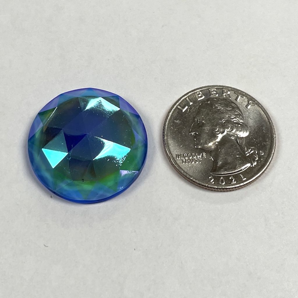 These are real Dichroic Coated glass jewels with the front face itself coated, not a thin piece of dichroic laminated to the back side. These real Dichroic coated treasures will catch the light differently with each facet or textured detail of the jewel. It is hard to describe the stunning effect. Each jewel will have variations of color which gives them a dynamic look, changing with light angles. The edge thickness can also vary slightly, the small ones at times slightly less than 1/8″ and the larger jumbo jewels running a little thicker at times.