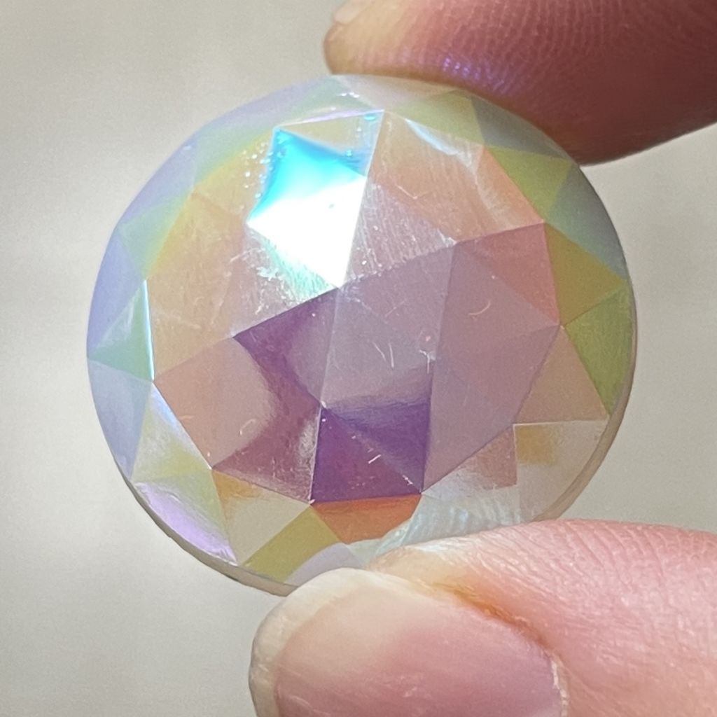 These are real Dichroic Coated glass jewels with the front face itself coated, not a thin piece of dichroic laminated to the back side. These real Dichroic coated treasures will catch the light differently with each facet or textured detail of the jewel. It is hard to describe the stunning effect. Each jewel will have variations of color which gives them a dynamic look, changing with light angles. The edge thickness can also vary slightly, the small ones at times slightly less than 1/8″ and the larger jumbo jewels running a little thicker at times.