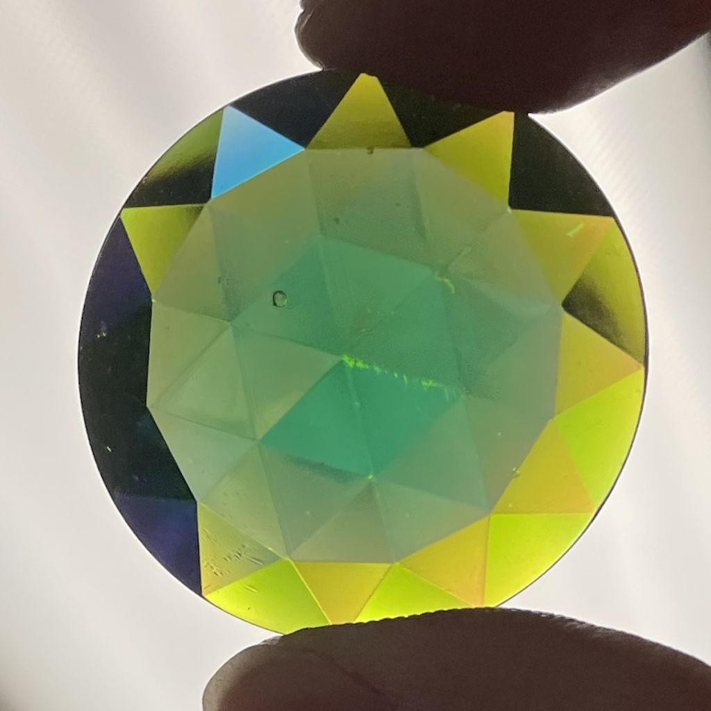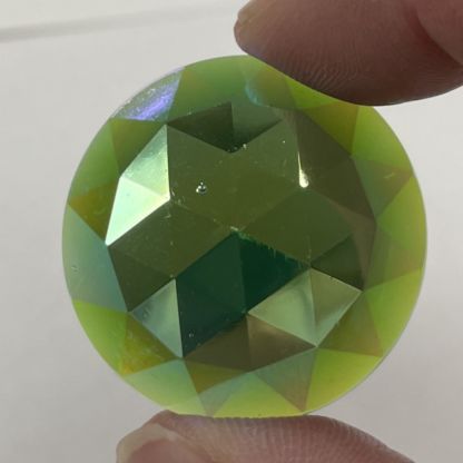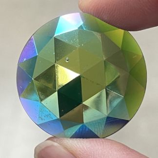 This 30mm (1 3/16″) Round Faceted Jewel has a transparent Aquamarine base and is very eye-catching with it’s dichroic coating.