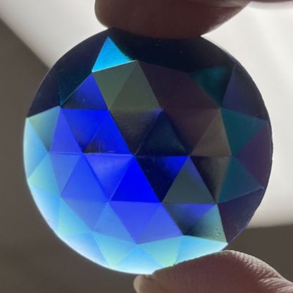 This 30mm (1 3/16″) Round Faceted Jewel has a transparent Cobalt base and is very eye-catching with it’s dichroic coating.
