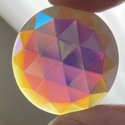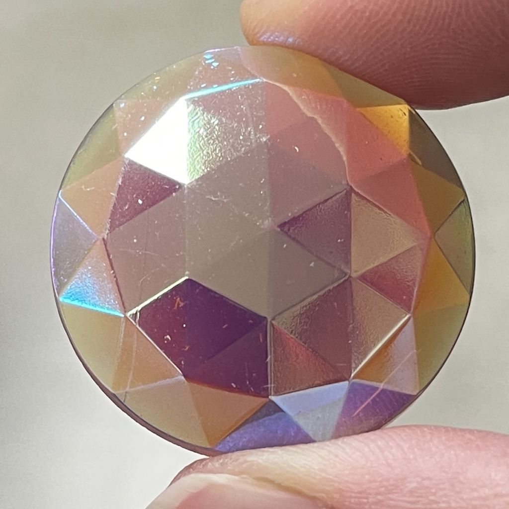 These are real Dichroic Coated glass jewels with the front face itself coated, not a thin piece of dichroic laminated to the back side. These real Dichroic coated treasures will catch the light differently with each facet or textured detail of the jewel. It is hard to describe the stunning effect. Each jewel will have variations of color which gives them a dynamic look, changing with light angles. The edge thickness can also vary slightly, the small ones at times slightly less than 1/8″ and the larger jumbo jewels running a little thicker at times.