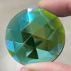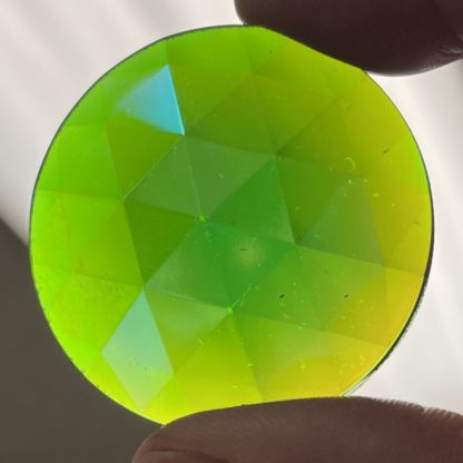 This 40mm (1 1/2″) Round Faceted Jewel has a transparent Emerald Green base and is very eye-catching with it’s dichroic coating.