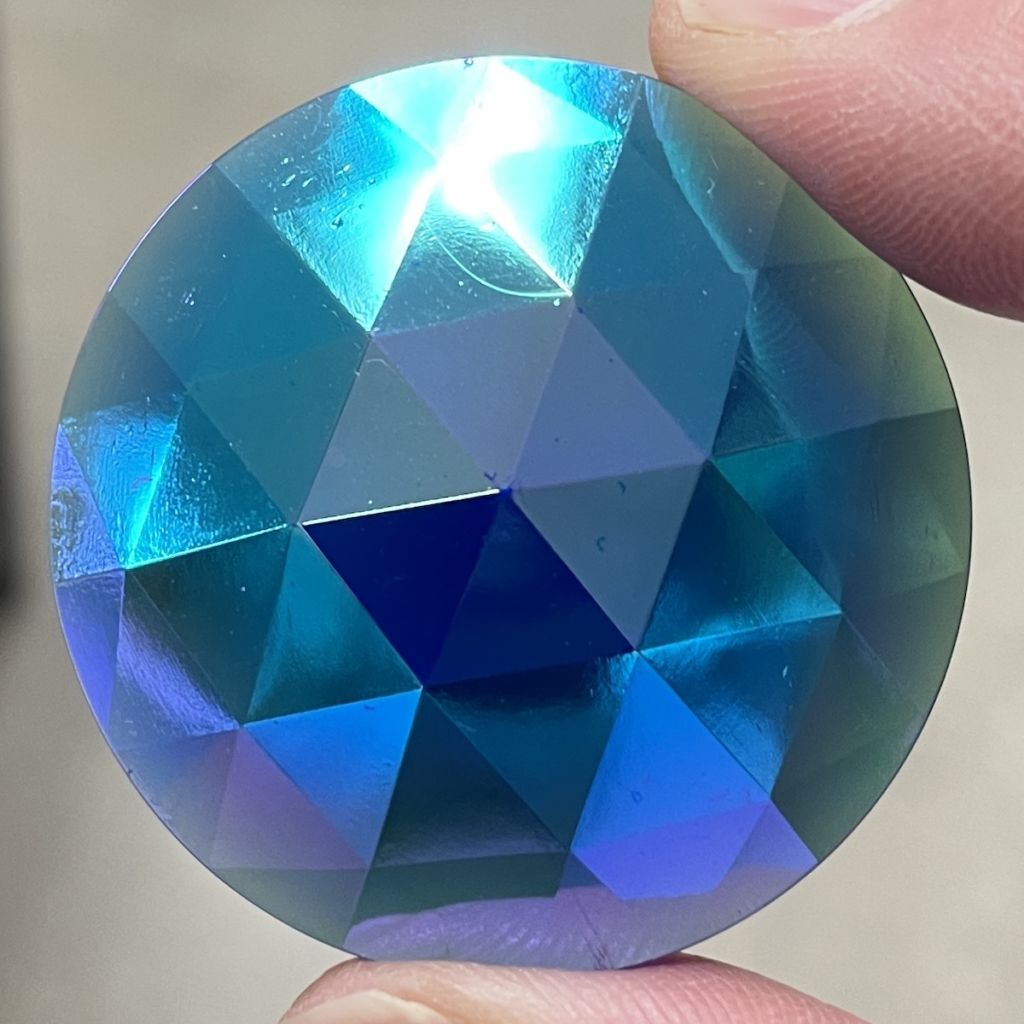 This 40mm (1 1/2″) Round Faceted Jewel has a Cobalt Blue base and is very eye-catching with it’s dichroic coating.