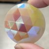 These are real Dichroic Coated glass jewels with the front face itself coated, not a thin piece of dichroic laminated to the back side. These real Dichroic coated treasures will catch the light differently with each facet or textured detail of the jewel. It is hard to describe the stunning effect. Each jewel will have variations of color which gives them a dynamic look, changing with light angles. The edge thickness can also vary slightly, the small ones at times slightly less than 1/8″ and the larger jumbo jewels running a little thicker at times.