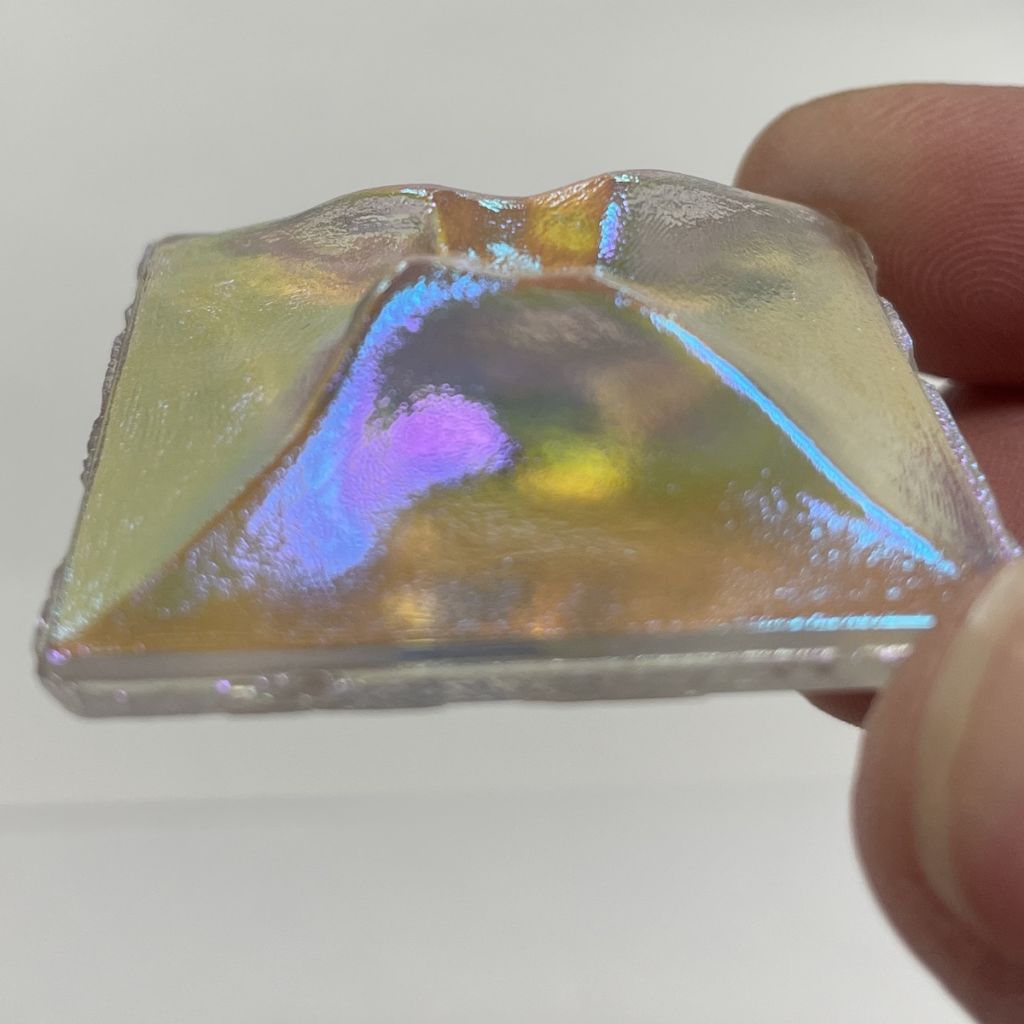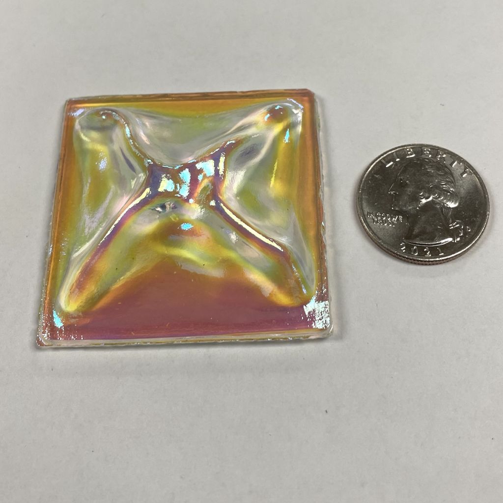 These are real Dichroic Coated glass jewels with the front face itself coated, not a thin piece of dichroic laminated to the back side. These real Dichroic coated treasures will catch the light differently with each facet or textured detail of the jewel. It is hard to describe the stunning effect. Each jewel will have variations of color which gives them a dynamic look, changing with light angles. The edge thickness can also vary slightly, the small ones at times slightly less than 1/8″ and the larger jumbo jewels running a little thicker at times.