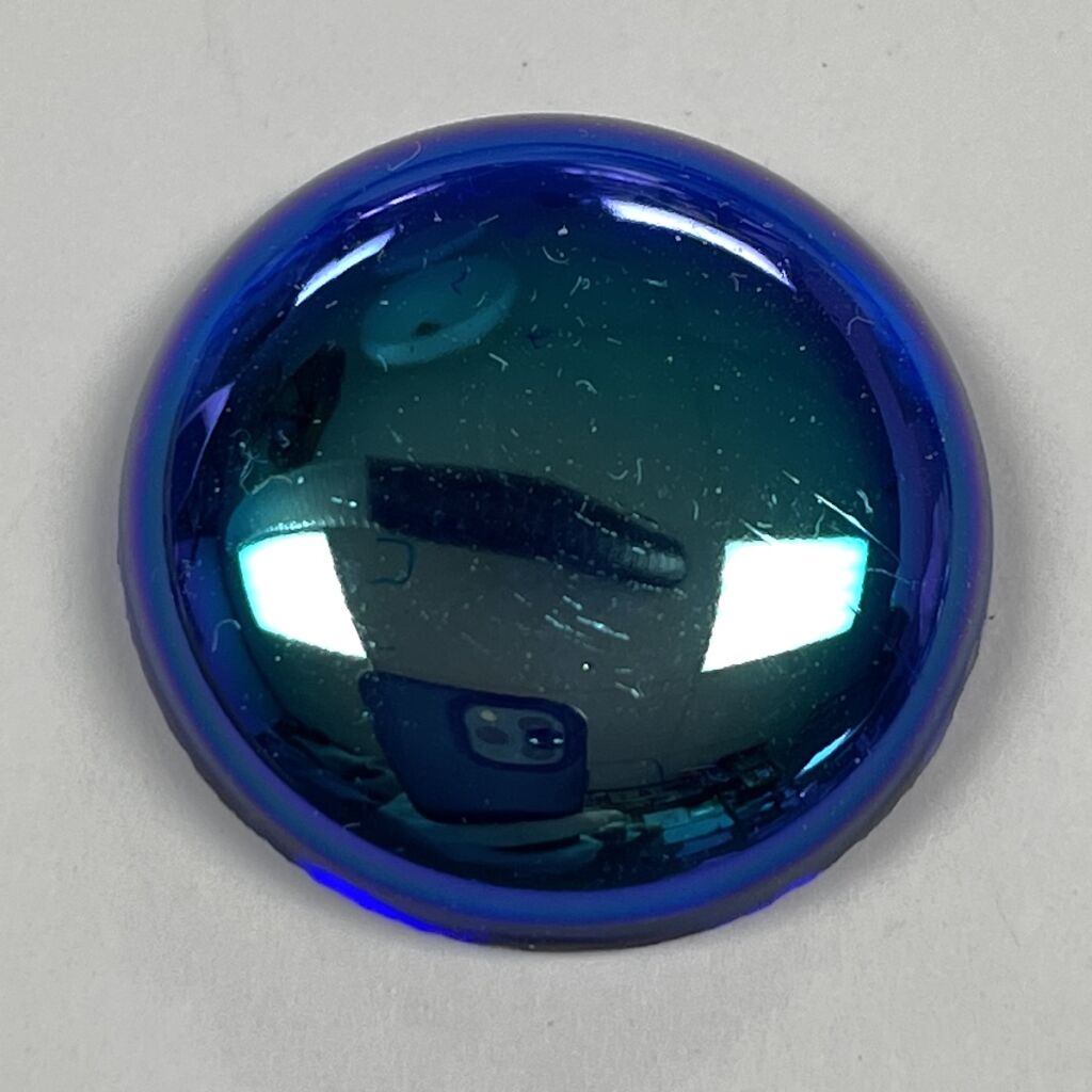These are real Dichroic Coated glass jewels with the front face itself coated, not a thin piece of dichroic laminated to the back side. These real Dichroic coated treasures will catch the light differently with each facet or textured detail of the jewel. It is hard to describe the stunning effect. Each jewel will have variations of color which gives them a dynamic look, changing with light angles. The edge thickness can also vary slightly, the small ones at times slightly less than 1/8″ and the larger jumbo jewels running a little thicker at times.