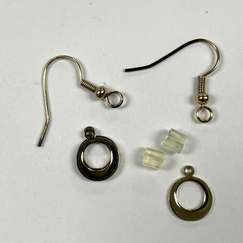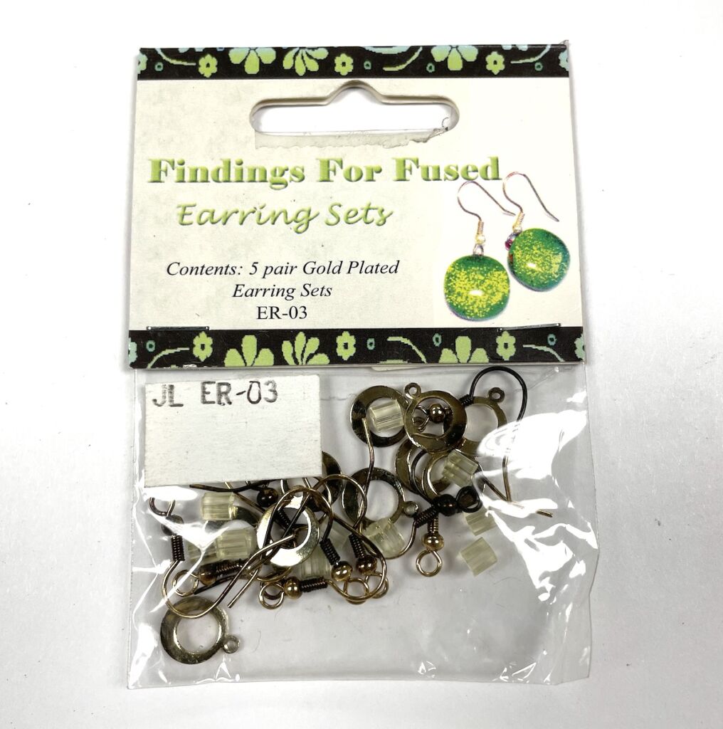 Gold plated Earring Sets includes wires, discs to attach fused stones, and plastic holders. These are a bit tarnished but can be cleaned with a metal polish. Includes 5 packs of 5 pairs – 25 pairs total.