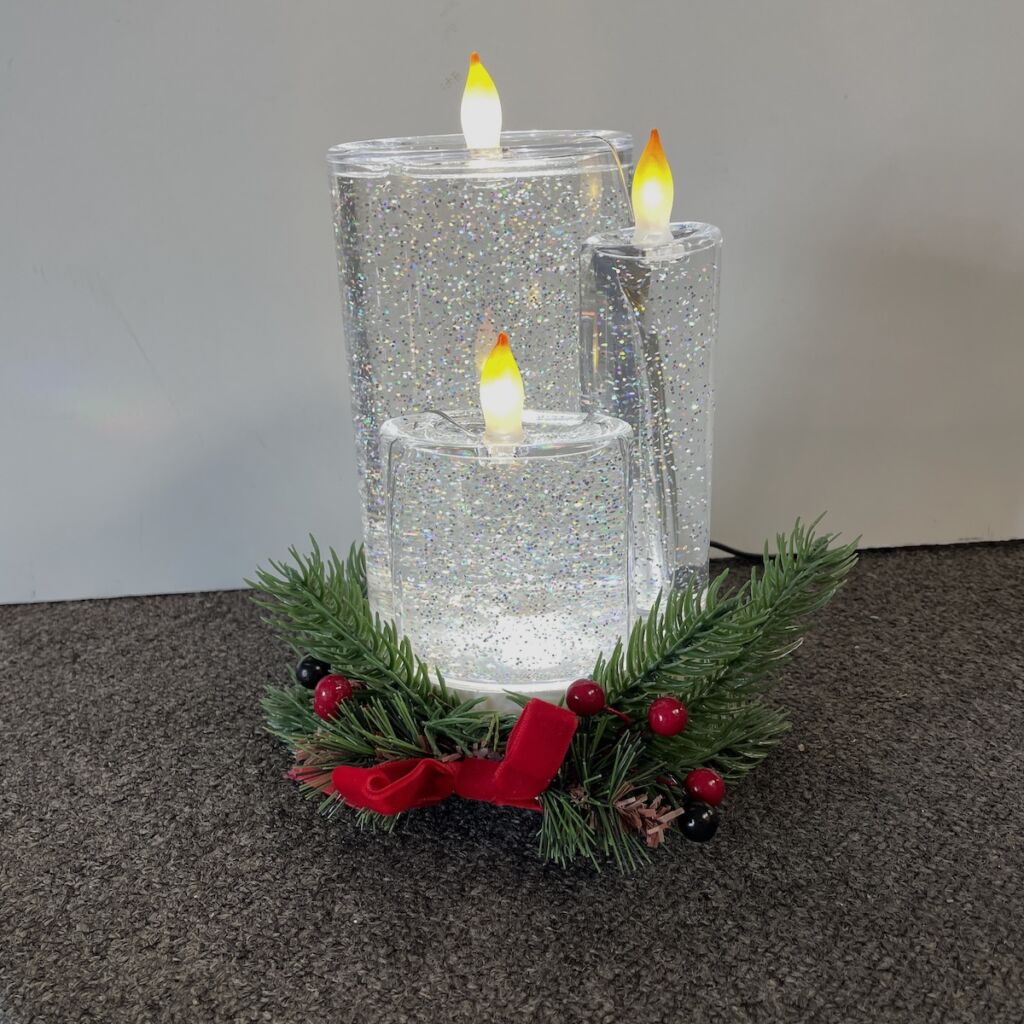 Acrylic LED Light Up Triple Candle. Dimensions: 5″ W. x 9″ H. Battery operated-3 AA not included