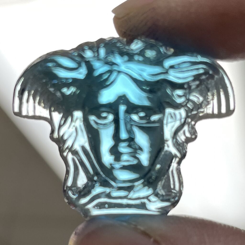 This Turquoise 3-D Medusa Jewel would be stunning in a jewelry piece. The face is 3/8″ thick in places and has a flat back. It measures 30mm (1 1/4 “) wide x 28mm (1 1/16”). These jewels are first quality and made in Germany.