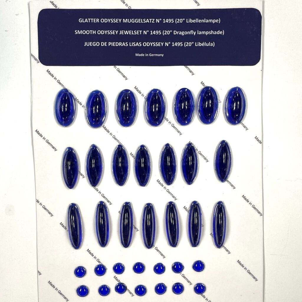 Odyssey Smooth Blue Jewel Set for 20″ Odyssey Dragonfly Lamp shade, made in Germany. Includes 7) 38mm x 21mm Ovals, 7) 43mm x 16mm Ovals, 7) 48mm x 14mm Ovals and 14) 13mm round jewels. Odyssey jewels are hand cast one at a time, just like the original Tiffany jewels were. Internal bubbles and surface irregularities are recreated to give you the hand-made look of the originals.