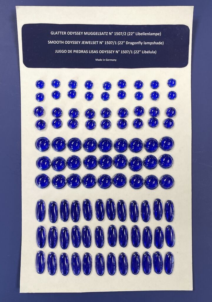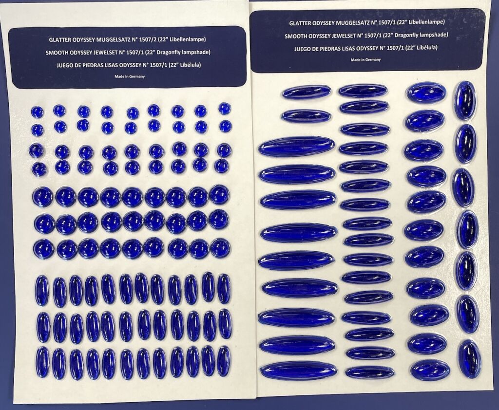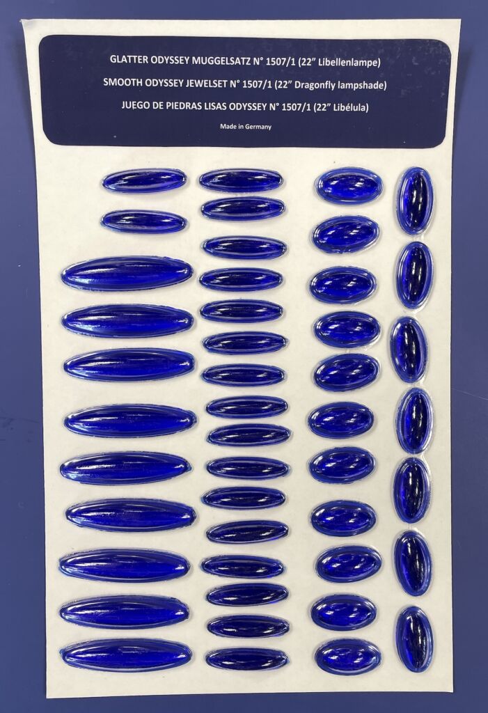 Odyssey Smooth Blue Jewel Set for 22″ Odyssey Dragonfly Lamp shade, made in Germany.Includes 18) 12mm round, 18) 14mm round, 27) 20mm round, 36) 30mm x 13mm oval, 18) 38 x 21mm oval, 18) 48 x 13mm Oval and 9) 75x 19mm Oval Jewels . Odyssey jewels are hand cast one at a time, just like the original Tiffany jewels were. Internal bubbles and surface irregularities are recreated to give you the hand-made look of the originals.