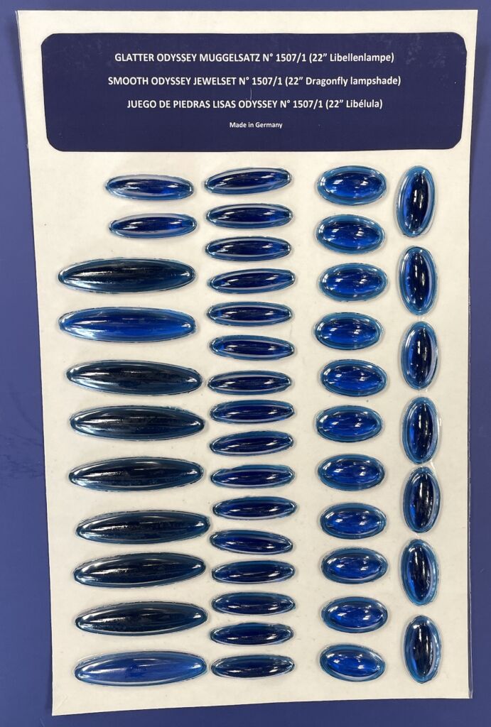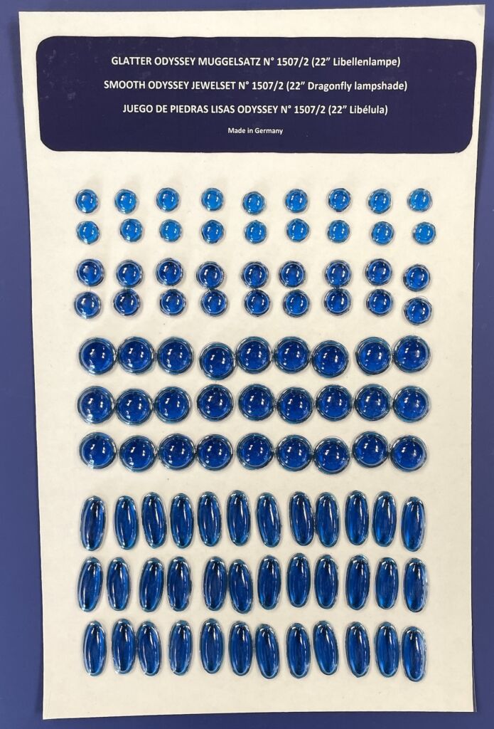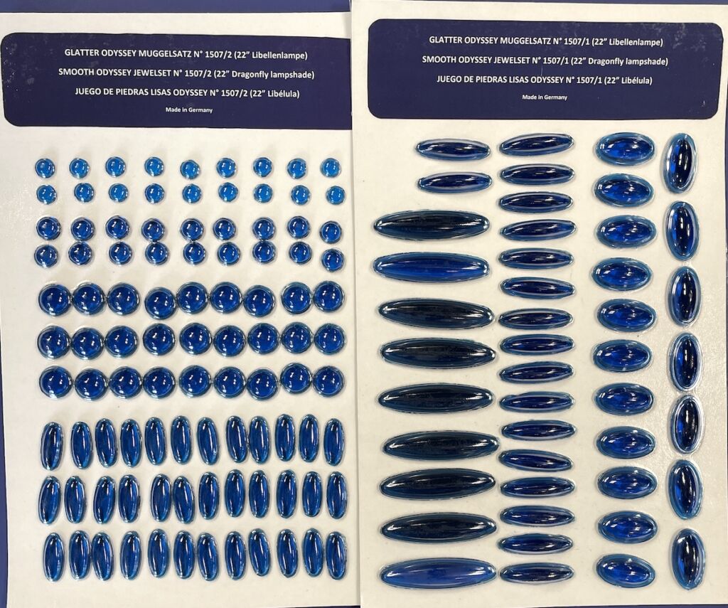 Odyssey Smooth Turquoise Jewel Set for 22″ Odyssey Dragonfly Lamp shade, made in Germany. Includes 18) 12mm round, 18) 14mm round, 27) 20mm round, 36) 30mm x 13mm oval, 18) 38 x 21mm oval, 18) 48 x 13mm Oval and 9) 75x 19mm Oval Jewels . Odyssey jewels are hand cast one at a time, just like the original Tiffany jewels were. Internal bubbles and surface irregularities are recreated to give you the hand-made look of the originals. Because of the value of these jewels, your signature will be required when delivered.