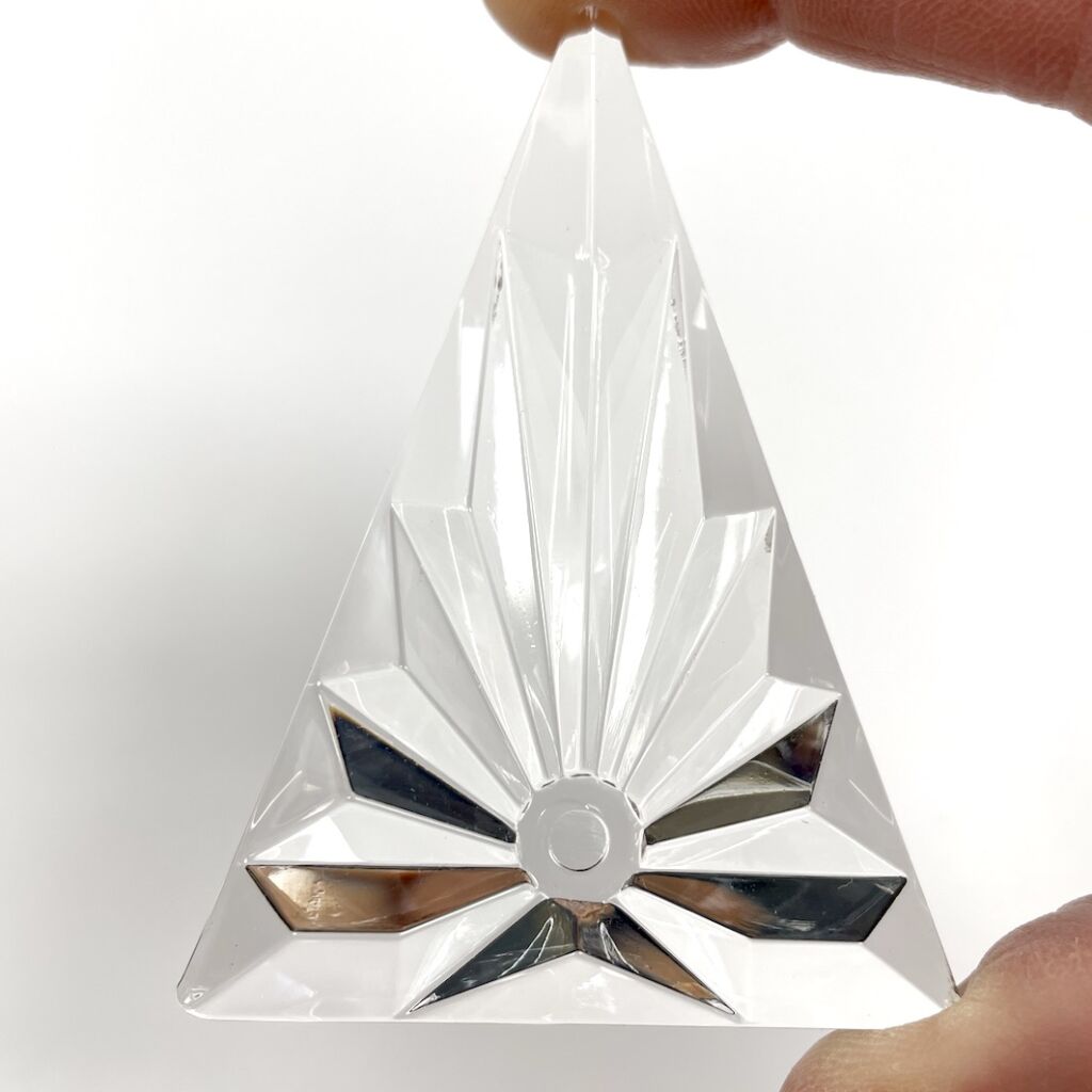 Clear Pressed Triangle Jewel (76mm x 52mm). These jewels are made in Germany and would look stunning in a box top or centerpiece to a stained glass panel. There is a small round inset that you can glue an 8mm jewel to add some color.
